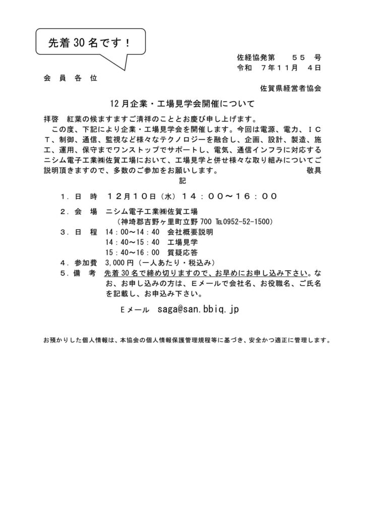 12月企業・工場見学会開催について